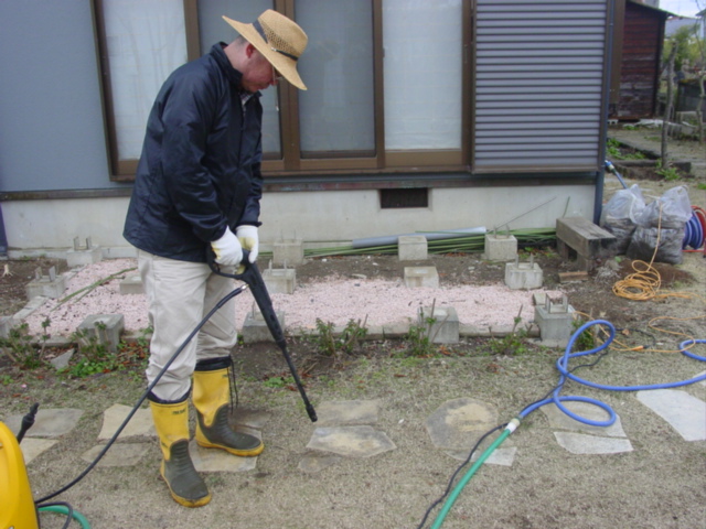 (2011年12月01日) 敷石の高圧洗浄 (作業中) (作業中) (作業中) (作業中) 芝生の中の飛び石を 高圧洗浄。 思い出のジュラストーンは 再利用。 塾 長 (ピカイチ先生)